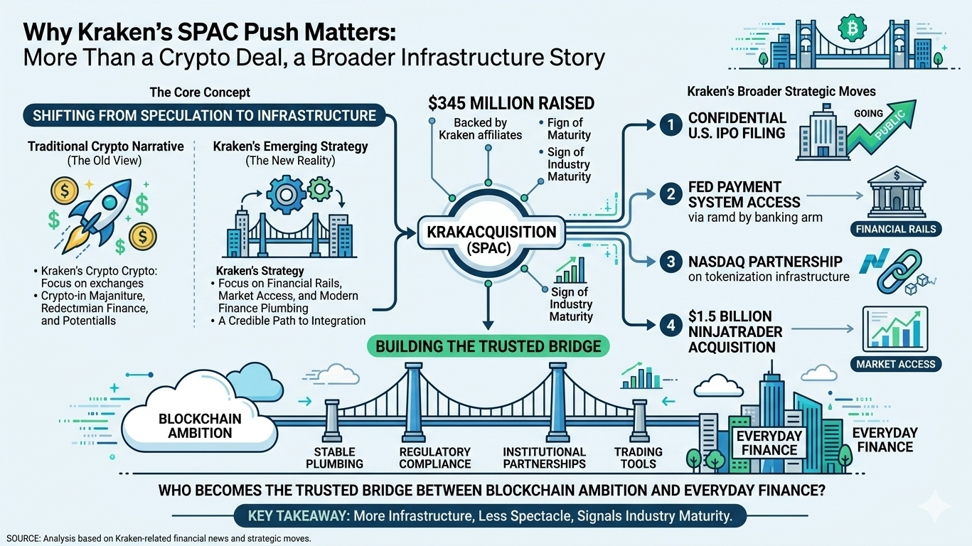 La storia SPAC di Kraken sta attirando attenzione perché sembra meno una scommessa crypto appariscente e più un segno che l'industria sta cercando di crescere. KRAKacquisition, sostenuta da affiliati di Kraken, ha raccolto $345 milioni ed è ora parte di una conversazione più ampia su dove va il dealmaking crypto. Questo è importante ora perché Kraken stessa ha presentato riservatamente domanda per un'IPO negli Stati Uniti, ha recentemente ottenuto accesso limitato al sistema di pagamento centrale della Fed attraverso la sua divisione bancaria e si è appena alleata con Nasdaq per l'infrastruttura di tokenizzazione. Aggiungi l'acquisizione da $1,5 miliardi di NinjaTrader della società, e inizia a emergere un pattern. Questo sembra meno una storia di trading crypto pura e più una spinta più ampia verso le infrastrutture finanziarie, l'accesso al mercato e le tubature che stanno dietro la finanza moderna. La mia impressione è che questo sia il momento in cui la crypto appare più credibile: meno spettacolo, più infrastruttura. La vera domanda è chi può davvero diventare un ponte fidato tra l'ambizione blockchain e la finanza quotidiana.