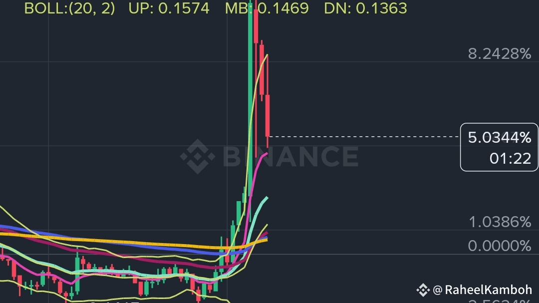 · 15M & 5M (L'Ingiresso di Precisione): Le EMA sono ALLINEATE RIALZISTE (10 > 20 > 50). Questo è il nostro semaforo verde per lo scalp. Il prezzo si sta accumulando proprio alla Banda Centrale di Bollinger ($0.1460-$0.1504), un classico trampolino per un movimento verso la Banda Superiore.