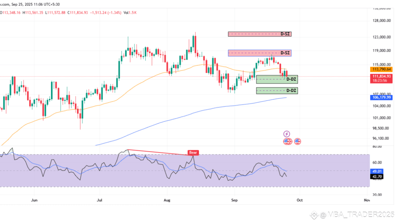 Momento: L'RSI orario nell'intervallo 30–44 significa che il momento al ribasso rimane dominante. Per un rimbalzo credibile, l'RSI deve riconquistare 50 e il prezzo deve mantenere 112.900+ in un retest.