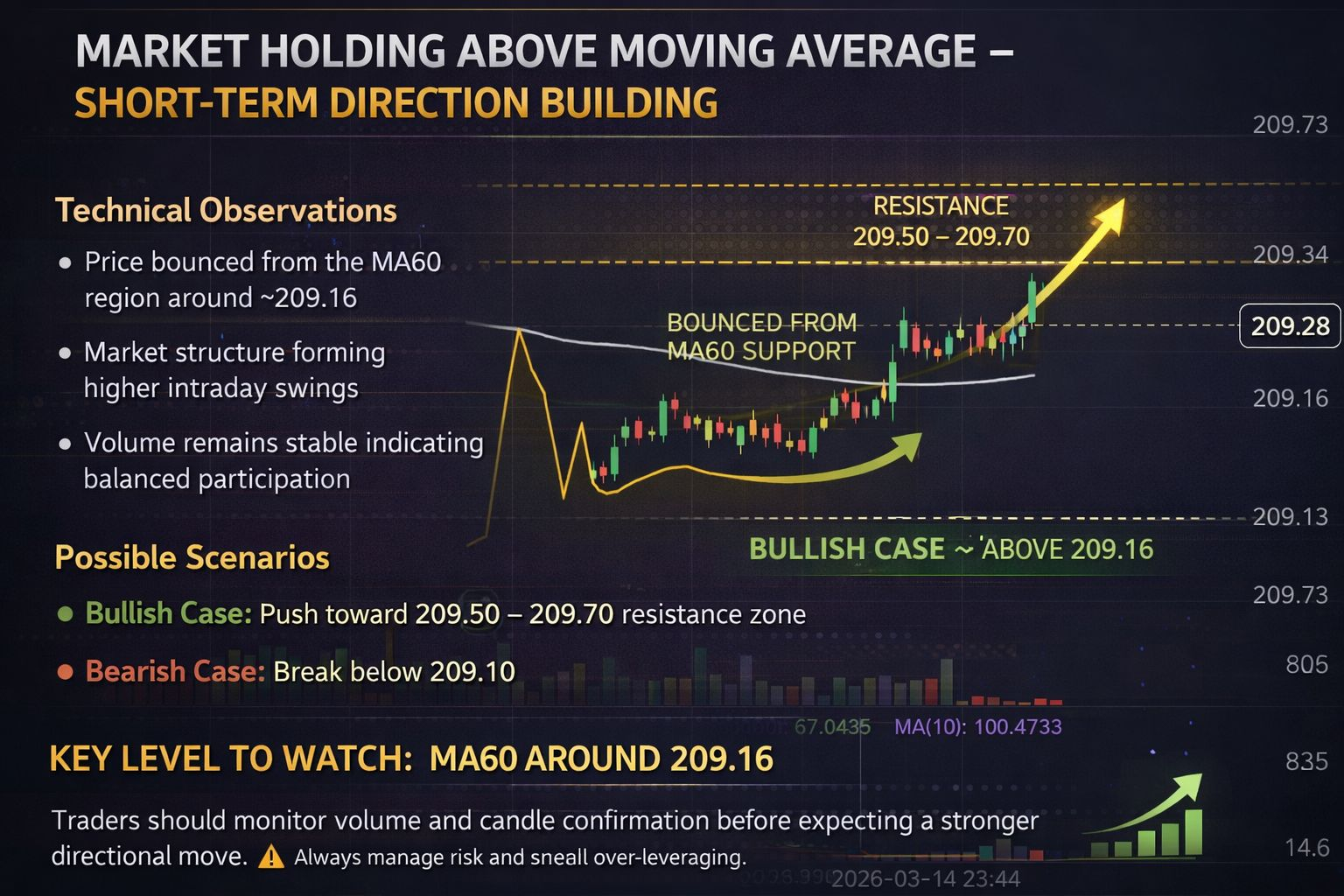 Bullish Case: If price holds above the moving average, a push toward 209.50 – 209.70 resistance zone could occur.