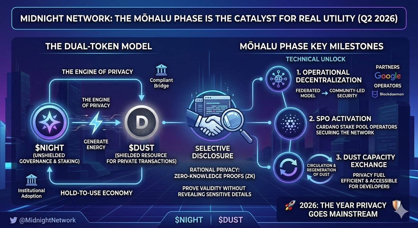 As we approach the end of March 2026, the buzz around @MidnightNetwork is shifting from theoretical potential to tangible delivery. While the federated mainnet launch is the immediate headline, the real technical "unlock" for $NIGHT holders lies in the upcoming Mōhalu phase, scheduled for Q2 2026.
