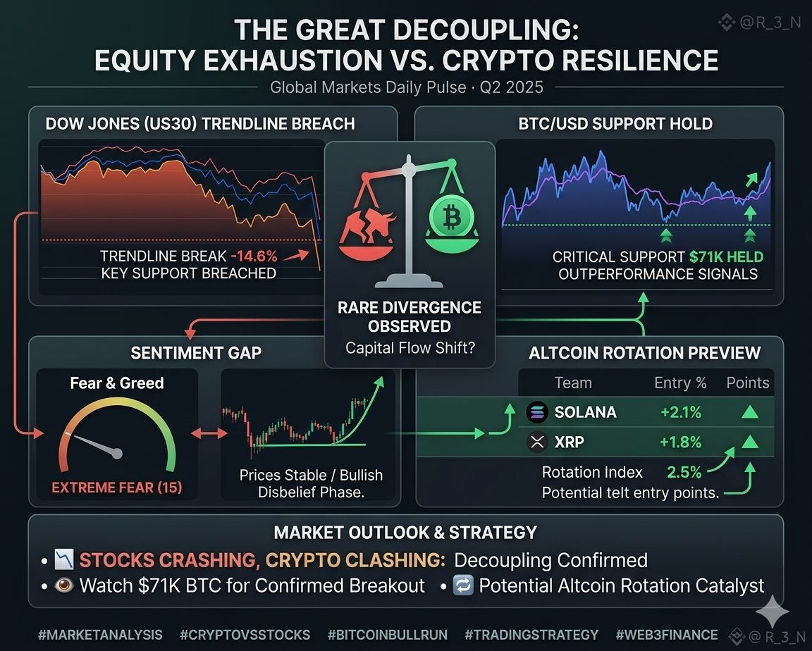 La narrativa sta cambiando. Mentre Wall Street sta sanguinando rosso e il Dow Jones lotta per rimanere sopra la sua linea di tendenza del 2025, le criptovalute stanno facendo qualcosa che quasi mai fanno: mantenere la linea. Ecco il controllo della realtà in 3 fasi: