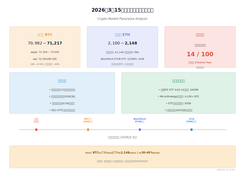 Il 15 marzo 2026, il mercato delle criptovalute ha mostrato una notevole resilienza sullo sfondo di un continuo aumento delle tensioni geopolitiche in Medio Oriente. Il prezzo del Bitcoin si è mantenuto sopra il livello di supporto chiave di 71.000 dollari, oscillando tra circa 70.982 e 71.217 dollari, con un rimbalzo di circa il 18% rispetto al minimo di 60.000 dollari causato dal conflitto tra Stati Uniti, Israele e Iran a febbraio. La struttura del mercato sta subendo profondi cambiamenti: MicroStrategy ha aumentato le proprie partecipazioni di oltre 4.100 BTC in un giorno, stabilendo un record, il primo giorno dell'ETF di staking ETHB di BlackRock ha superato un miliardo di dollari di gestione, e il programma di partnership globale di Mastercard ha incluso oltre 85 aziende native delle criptovalute. Nel frattempo, l'indice di paura e avidità del mercato si trova nella fascia di "estrema paura" a 14, in netto contrasto con il miglioramento tecnico di alcuni asset. Questo articolo offre un'analisi approfondita da quattro dimensioni: ambiente macroeconomico, analisi tecnica degli asset chiave, flusso di capitali e fattori di rischio, e propone suggerimenti per strategie operative differenziate.