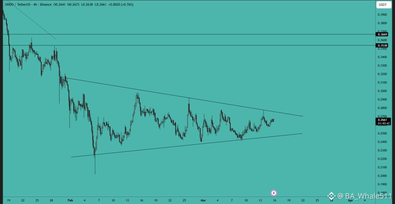 ONDO printed fresh lows and made a large triangle pattern now consolidating inside a symmetrical triangle on the 4H timeframe, showing compression as price forms higher lows against descending resistance; a breakout above the trendline could send it toward $0.29 – $0.35, while losing $0.25 support may trigger a move down to $0.23 – $0.22