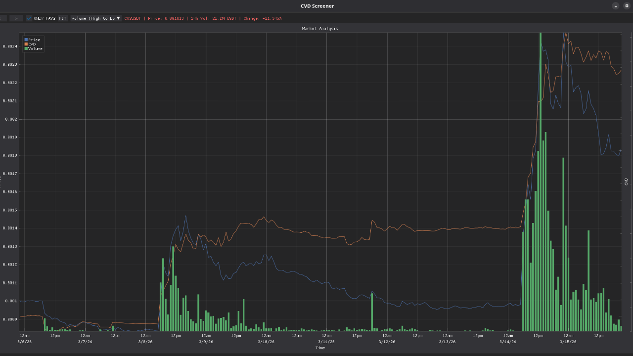 Guardiamo COS/USDT. Il 15 marzo, la moneta ha deciso che era un razzo e ha preso il volo con volumi folli.