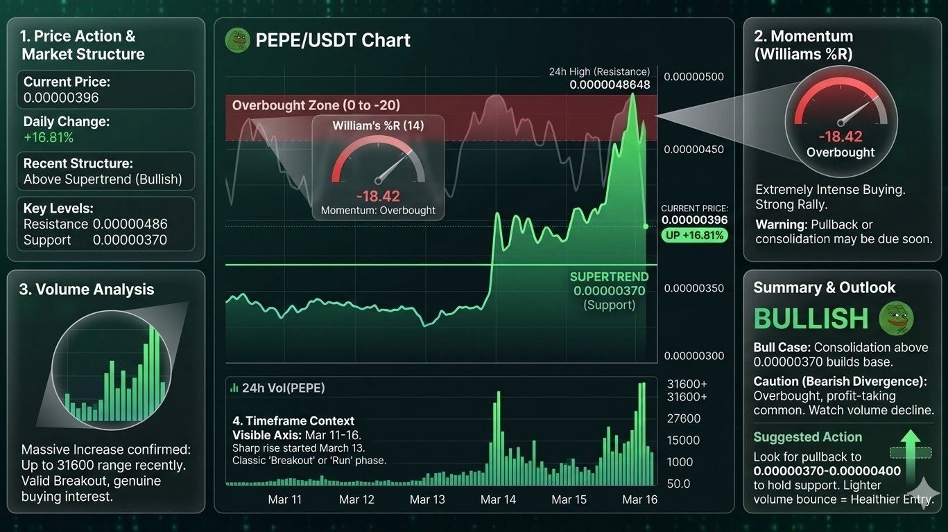Azione Suggerita: Cerca un potenziale ritracciamento nella fascia 0.00000370 - 0.00000400 per vedere se regge come supporto. Se rimbalza da quel livello su volume inferiore, potrebbe essere un punto d'ingresso più sano rispetto a inseguire il prezzo al massimo attuale.#PEPE创历史新高