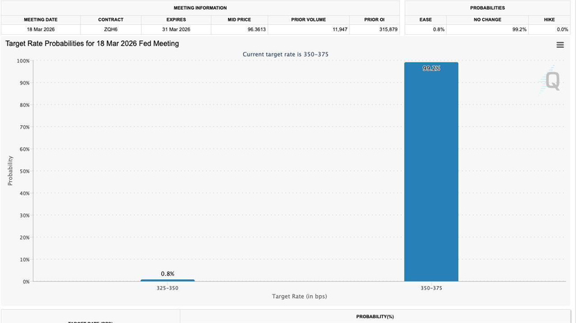 About that 99.2% chance the Fed keeps rates unchanged at their March 18 meeting staying in the 3.50 to 3.75% range it’s basically the market screaming “no way they’re cutting right now.”