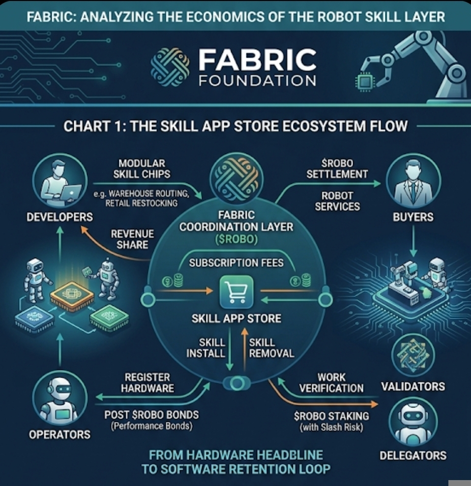 I remember the first time I started looking seriously at robot networks as token trades. My instinct was to treat them the same way the market usually does: find the hardware story, find the AI angle, check the float, then decide whether the chart is just another attention cycle wearing industrial clothing. That was the easy framework. What caught my attention with Fabric was something smaller and, honestly, a bit less flashy. Buried in the whitepaper was the idea of a robot skill app store, where modular “skill chips” can be installed and removed like phone apps, with subscription-style fees attached to usage. At first I assumed that was just branding. Over time that started to look different. It is not the robot that may become the recurring economic unit here. It may be the skill layer sitting on top of it.