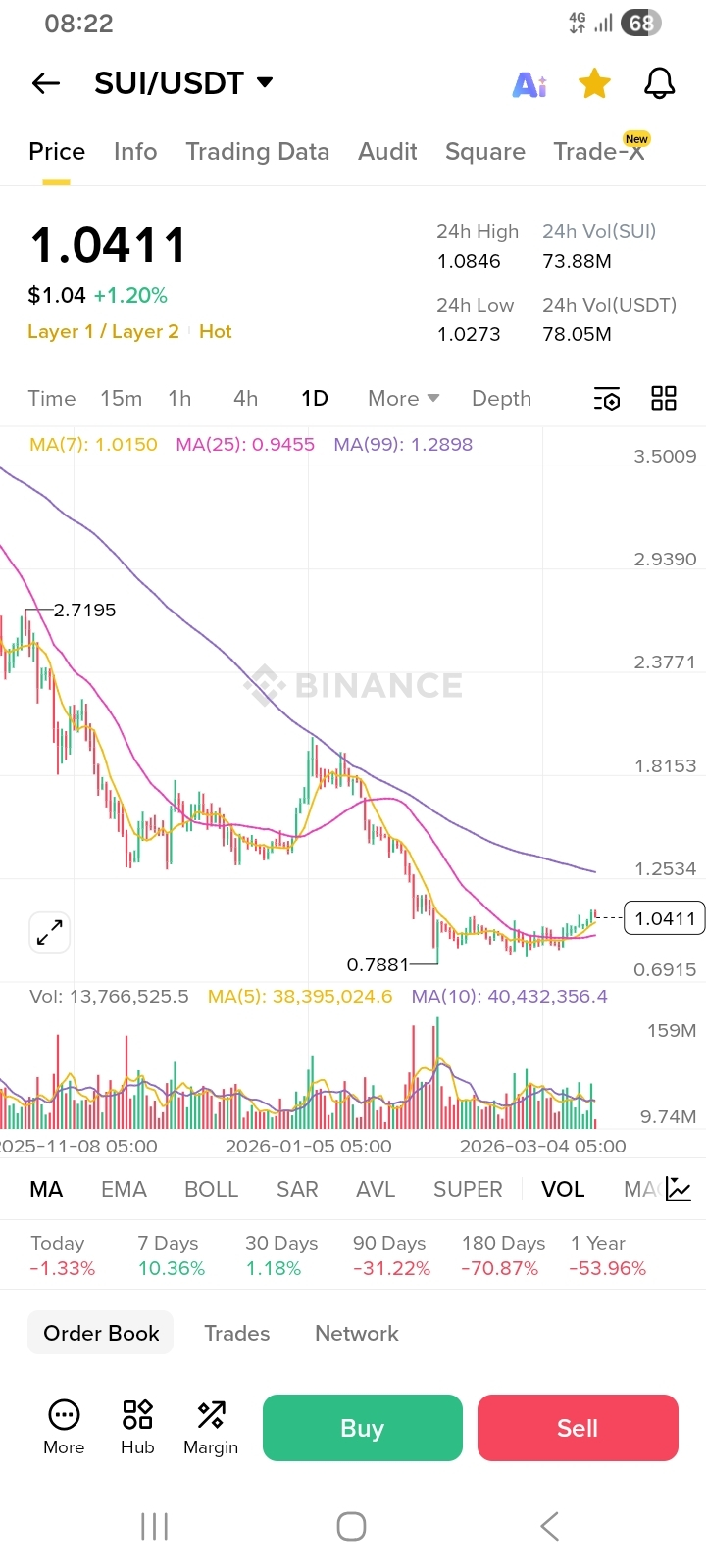 Currently, we are seeing a series of higher lows on the D1 timeframe. The RSI is trending upward at 62, suggesting there is still plenty of "fuel in the tank" before reaching overbought territory. If SUI can maintain a daily close above the $1.08 resistance, we could see a rapid move toward the next major liquidity zone.