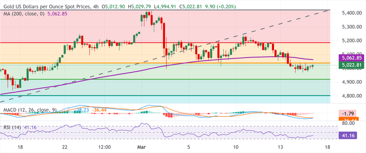 Immediate resistance emerges at the 38.2% Fibo. retracement near $5,040, followed by the 200-period SMA around $5,063, with a break above this zone needed to ease bearish pressure and open the way toward the 23.6% Fibo. retracement at $5,186. On the downside, initial support is located at the psychological $5,000 area, ahead of the recent lows near $4,995–$4,985, where failure would expose deeper retracement toward the 50.0% retracement level at $4,921.41. A sustained close back above the 200-period SMA would weaken the bearish tone, while continued rejection below $5,040 keeps the focus on lower supports.