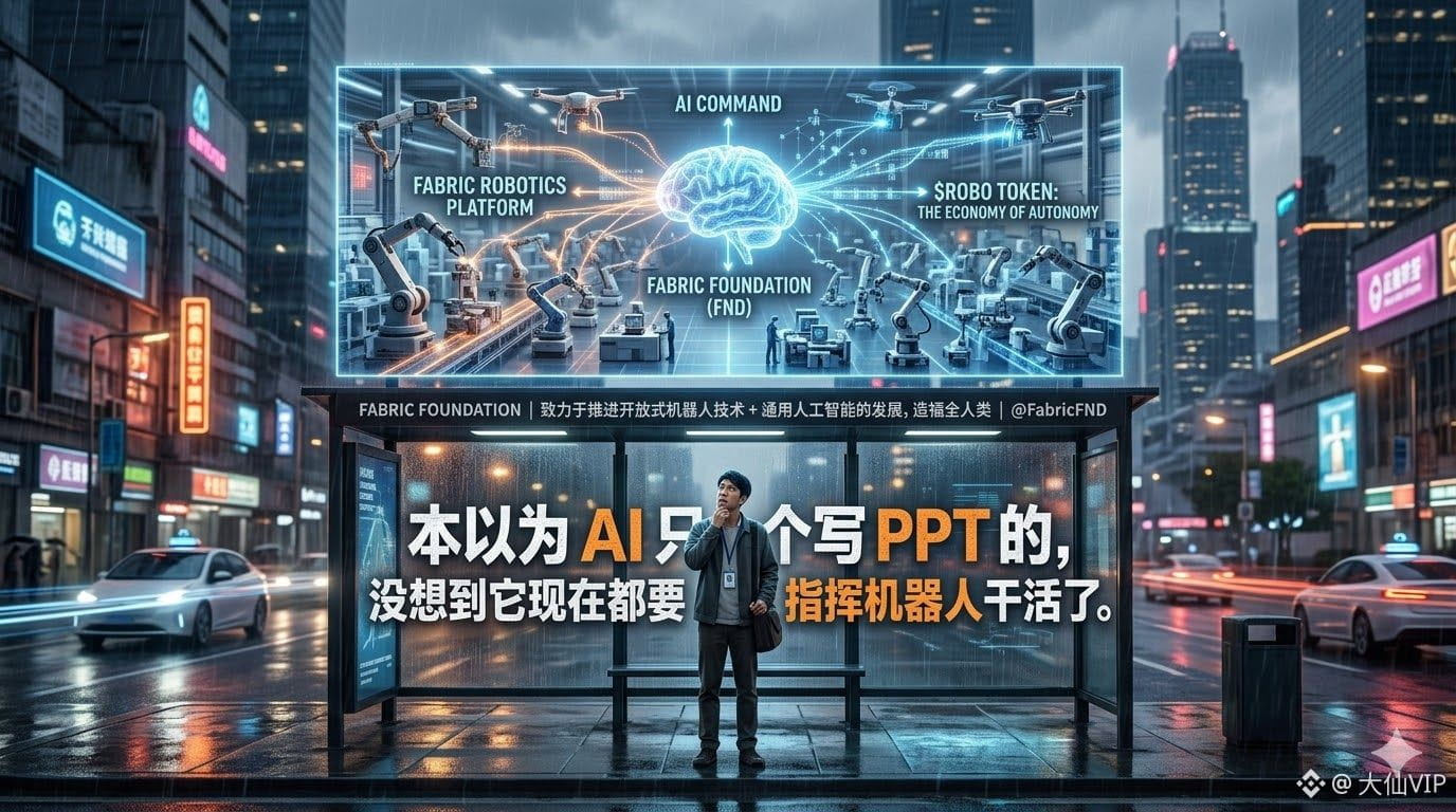 如果说以前的机器人还需要人类输入指令(If/Then),那么在 Fabric 的愿景里,基于 $ROBO 代币驱动的生态,AI 能够通过自我演化和通用智能,自主地指挥机器人完成复杂的现实任务。这意味着什么?这意味着生产力的协同不再需要“人类组长”,AI 自己就能当项目经理,指挥成千上万个机器人高效运转。