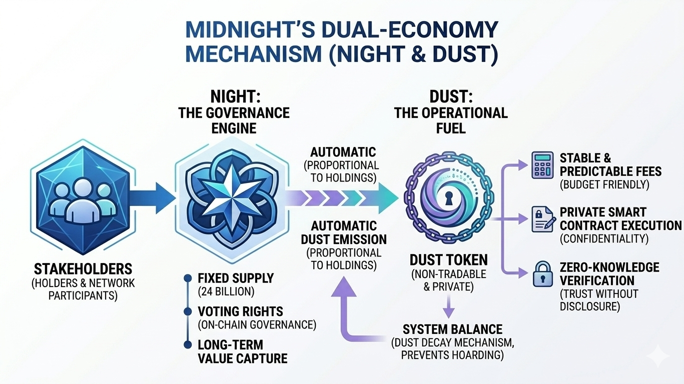 Credo che la vera magia di Midnight risieda nel suo sistema a doppio token. Invece di cercare di forzare un singolo token a gestire ogni singolo compito sulla rete, hanno deciso di separare la governance e le operazioni quotidiane tra due asset distinti noti come $NIGHT e DUST. In questo ecosistema, NIGHT rappresenta il lato della governance e la proprietà a lungo termine della rete, mentre DUST è qualcosa che viene generato automaticamente per uso operativo. Questo garantisce che le commissioni di transazione rimangano private e stabili nel tempo. Questo tipo di separazione è un cambiamento radicale perché rende l'intera rete molto più prevedibile e equa per tutti i soggetti coinvolti, inclusi gli sviluppatori che hanno bisogno di pianificare i loro budget mesi in anticipo.