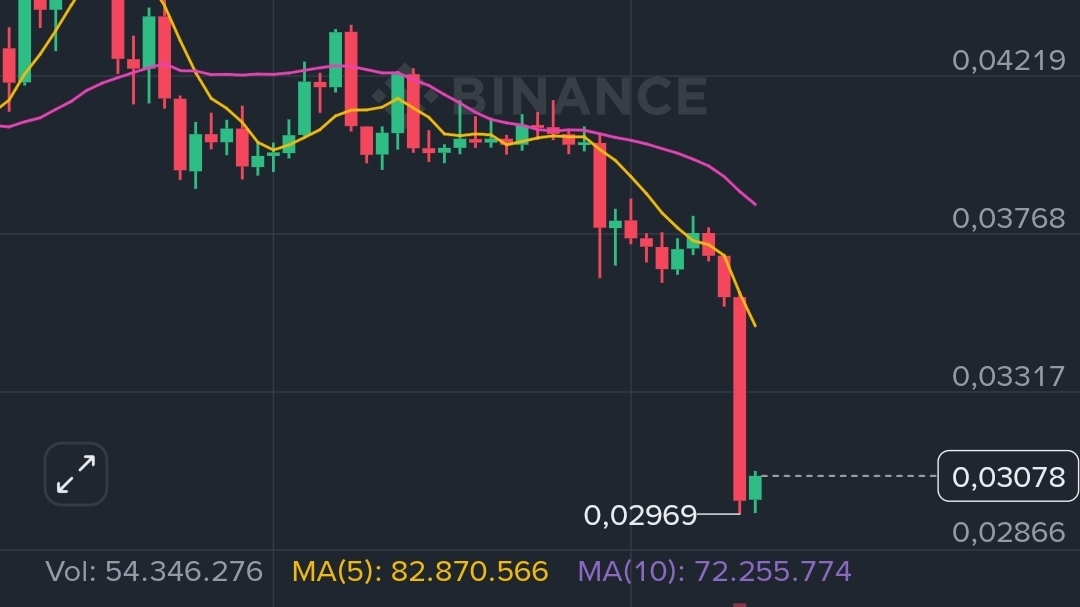 3.- Consolidamento Micro: In timeframe di 15m, il prezzo inizia a lateralizzare, cercando di trasformare i $0,030 in un supporto solido rispetto alla MA7.