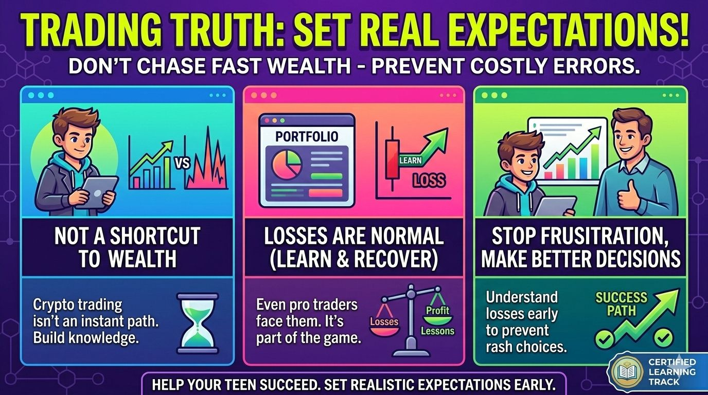 It is also important to set realistic expectations. Crypto trading is not a shortcut to quick wealth. Losses are a normal part of the process, and even experienced traders face them. Helping teens understand this early can prevent frustration and poor decision making.