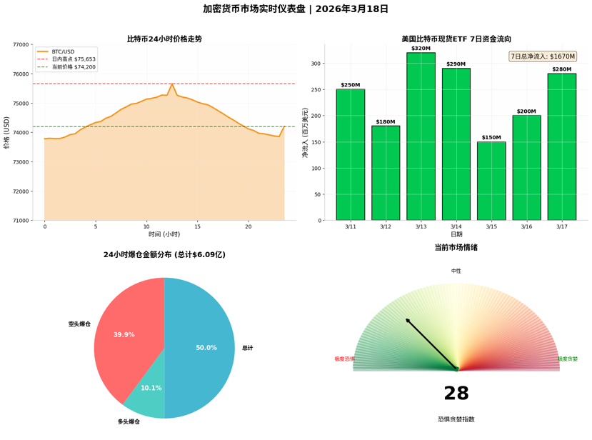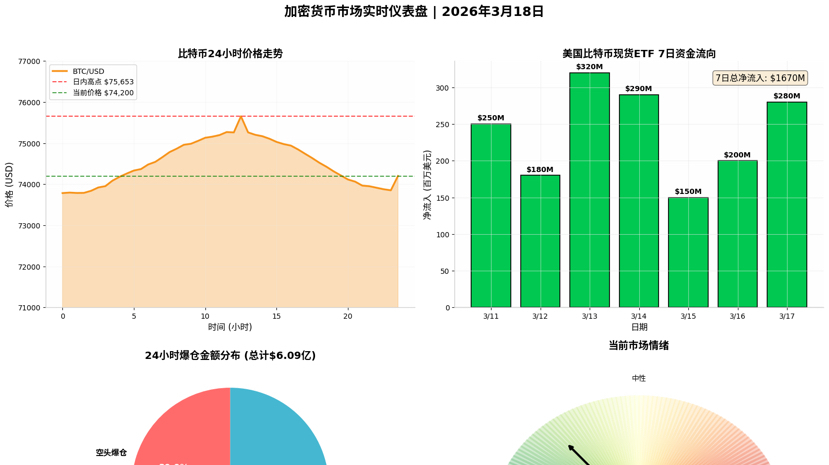 Il 18 marzo 2026, il mercato delle criptovalute si trova alla vigilia di un punto decisionale cruciale. Il Bitcoin è tornato a oscillare intorno ai 74.000 dollari dopo essere salito oltre i 75.000 dollari, mentre il mercato attende la decisione sui tassi della Federal Reserve. Negli ultimi 24 ore, l'importo totale delle liquidazioni nel mercato delle criptovalute è stato di circa 609 milioni di dollari, con le liquidazioni degli short che rappresentano quasi l'80%, evidenziando le caratteristiche di una corsa al rialzo. L'ETF Bitcoin spot degli Stati Uniti ha registrato sette giorni consecutivi di afflussi netti, per un totale di quasi 1,17 miliardi di dollari, con la domanda istituzionale che diventa un sostegno centrale. Dal punto di vista tecnico, si presenta una fase di consolidamento dopo la rottura di un triangolo simmetrico, con un supporto chiave a 73.000 dollari e una resistenza a 76.000 dollari. A breve termine, esiste il rischio di una correzione per divergenza ribassista dell'RSI, ma nel medio-lungo termine l'afflusso di capitali istituzionali e le aspettative di liquidità macroeconomica sosterranno il mercato rialzista. La strategia operativa suggerisce di accumulare in modo frazionato durante i ribassi, mantenendo un rigoroso controllo del rischio e evitando alti livelli di leva.