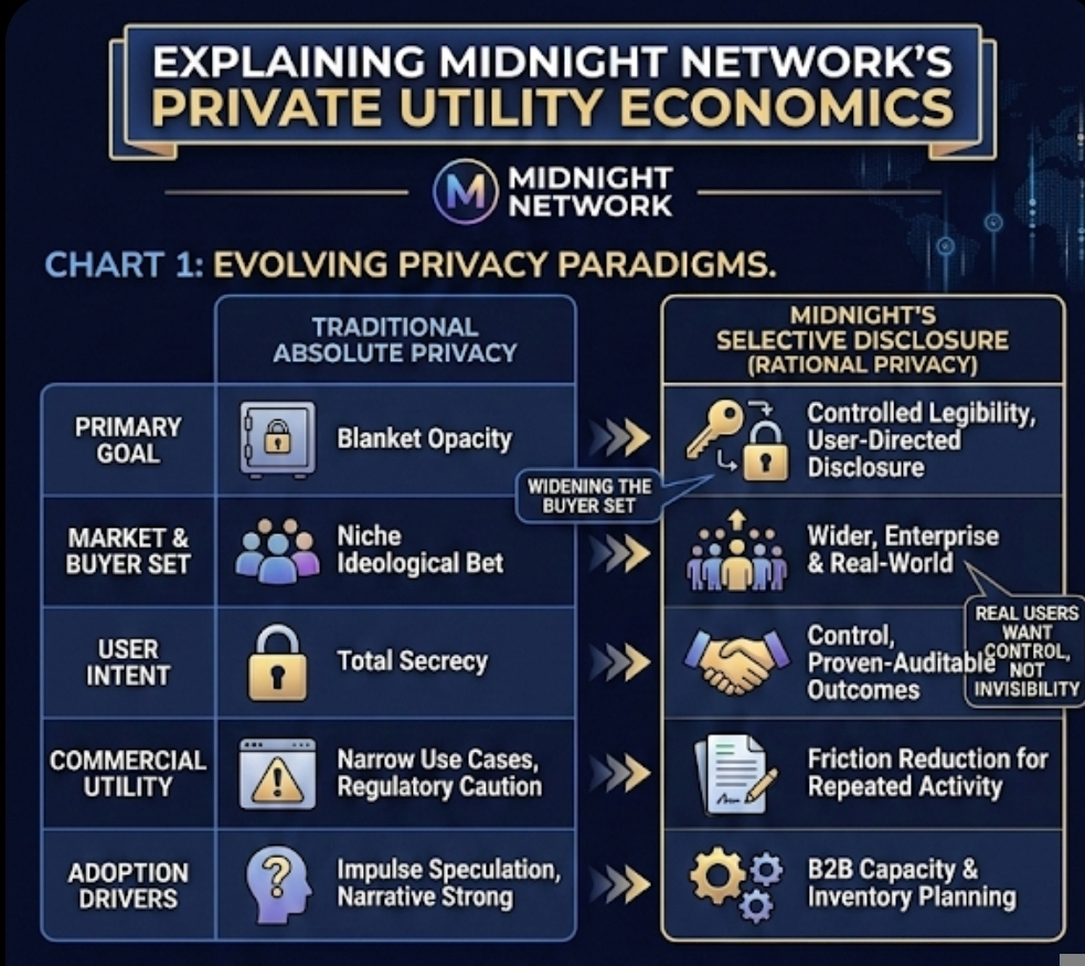 That distinction matters more than people think. Absolute privacy is emotionally strong as a narrative, but it narrows the buyer set. Selective disclosure widens it. A user can prove age without revealing a birth date. A firm can prove compliance without exposing all counterparties or internal records. Midnight is explicitly pitching that middle ground: private data handling with auditable outcomes when needed. From a trader’s perspective, that changes the question. I stop asking whether privacy is philosophically attractive and start asking whether this model can support recurring commercial behavior. That is a better question. Markets do not pay sustained premiums for ideals alone. They pay for systems that reduce friction for repeated activity.