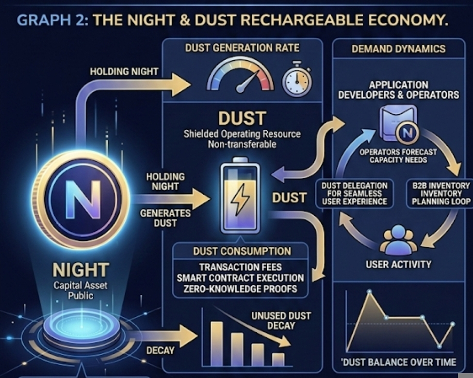 What caught my attention next was the economic design. Midnight separates the capital asset from the operating resource. NIGHT is the public token. DUST is the shielded, non-transferable resource used to power transactions and smart contract execution. Holding NIGHT generates DUST over time, and DUST decays if unused. Midnight describes it almost like a rechargeable battery rather than a spend-down gas token. That is an unusual structure, and I think the market still underestimates what it implies. If the model works, frequent users do not need to constantly market-buy the same way they would on a standard gas chain. They need access to capacity. That can be their own NIGHT balance, or delegated DUST from an application provider.
