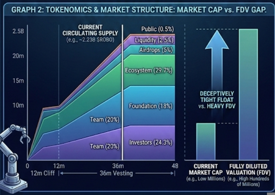 The tokenomics are worth slowing down for because this is where a good story can still become a bad trade. The whitepaper fixes total supply at 10 billion $ROBO. Of that, 24.3% goes to investors and 20% to team and advisors, both with a 12-month cliff and 36-month linear vesting. Foundation reserve gets 18%, ecosystem and community 29.7%, airdrops 5%, liquidity provisioning 2.5%, and public sale just 0.5%. That tells me two things. First, the float can look deceptively tight early, especially if staking and governance locks absorb part of circulation. Second, FDV can stay psychologically heavy for a long time unless real usage starts soaking up supply. Fabric’s own supply model is built around vesting releases, work bonds, governance locks, burns, and fee-driven buybacks, which is elegant on paper, but it also means traders need to separate “circulating squeeze” from actual economic demand.