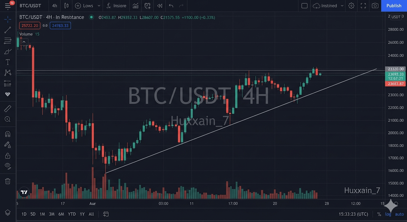 This 4-hour chart visualizes the current structure for Bitcoin. We see strong ascending support and a key overhead resistance level that is critical for confirming the next leg of the bull run.