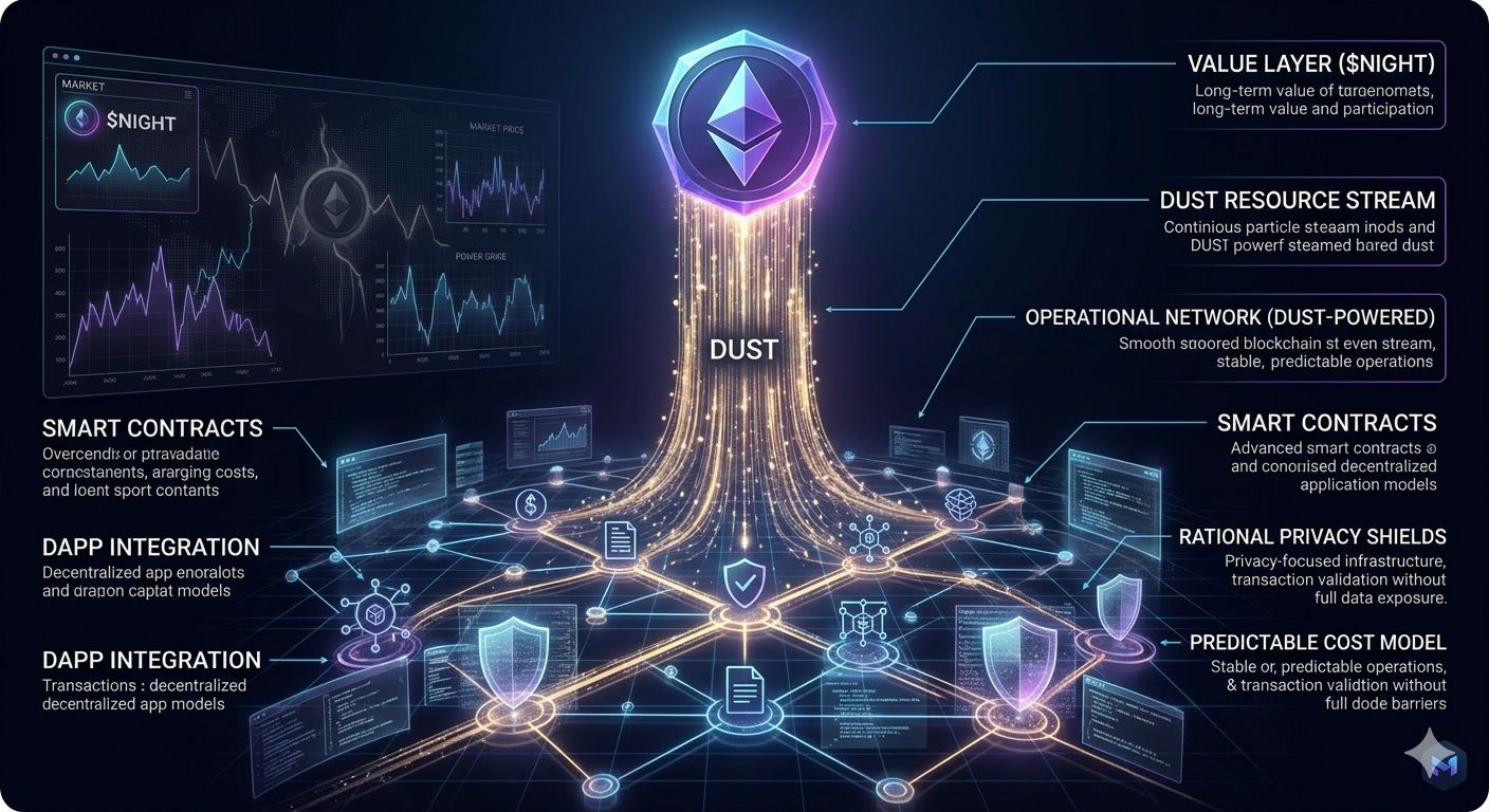 Instead of forcing one token to handle every function, the network is built around a dual tokenomics model involving $NIGHT and DUST. In this system, $NIGHT acts as the core utility token, but it is not directly consumed when users interact with the network.