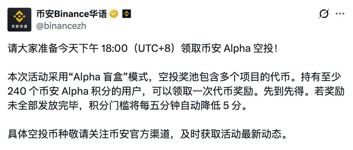 好消息!本周第一个 Alpha 空投终于来了