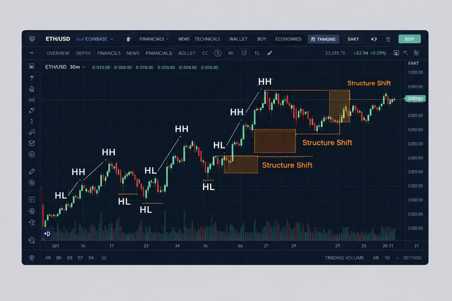 Markets are not random — they move in structure. Uptrends form higher highs and higher lows. Downtrends form lower highs and lower lows. Ranges build accumulation and distribution zones. Understanding this structure gives traders directional bias and prevents emotional counter-trend trades.