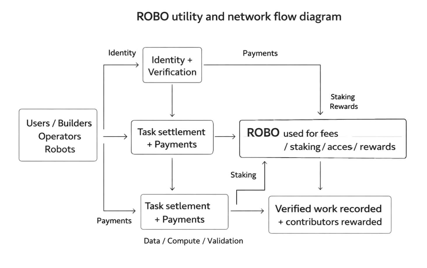 According to Fabric’s official token post, ROBO is used for network fees tied to payments, identity, and verification. It is also used for coordination staking, ecosystem access, and rewards for verified work such as task completion, data contribution, compute, and validation. Another official infrastructure post says ROBO serves as the settlement layer for protocol-level transactions including identity verification, task settlement, coordination staking, and ecosystem access.