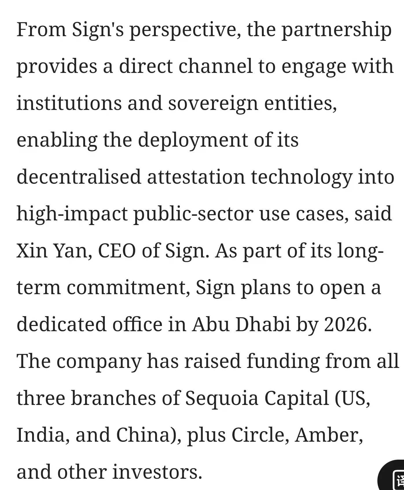 从Sign首席执行官Xin Yan的发言中也能看出,Sign提供了直接渠道,也在和机构及主权实体方面有了更深层次的互动,Sig应用于有重大影响力的公共部门的场景将会实现。也看见了一个承诺Sign计划会在阿布扎比设立一个专门的办事处。Sign也从三家分支机构以及Circle,Amber及其他投资者处筹集了资金用于建设。这个技术命中了中东方面的刚需(战火带来的机遇+本身的主权觉醒),未来应该着重在中东周边国家发展,用塞拉利昂,吉尔吉斯斯坦等主权项目落地的经验,在中东创造新的机遇,打破技术方面的垄断(VISA/MasterCard的自主系统)避险基建价值在中东验证落地,后面发展要拓展至埃及,约旦,伊朗等(MENA地区),覆盖MENA地区,并且建设成为中东数字主权基建标准的领头羊就是未来成长的主要方向,这个是我个人的观点“解决政务还有身份,跨境数据的可信问题,是中东地缘政治中数据安全的核心刚需啊,对Sing也是一种机遇,也是一种挑战。