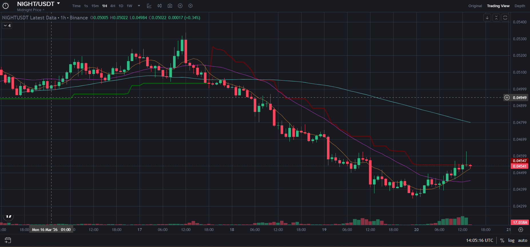 $NIGHT is at $0.0456 today. $733.2M market cap. 16.6B out of 24B circulating. 57% below ATH. mainnet this month. March 20 2026.Midnight Price day chart
