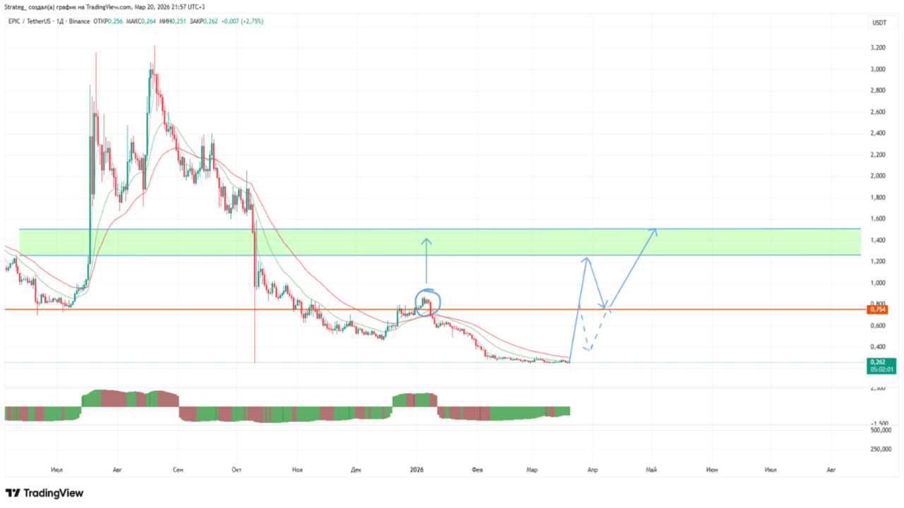 Рынок пока остается крайне низковолатильным, но мы постепенно приближаемся к самому сильному сезонному циклу роста в году – апрелю. Уже начиная со следующей недели начнет увеличиваться вероятность крупных волн роста по отдельным монетам. На этом фоне можно сделать дополнительные покупки по монетам. На сегодняшний день к крайне сильной долгосрочной поддержке пришел EPIC и уже формируется разворот. Поход ниже 0.250 крайне маловероятен в связи с полной эмиссией. В ближайшей волне можно рассчитывать на ретест 0.750 и в случае пробоя выше есть вероятность похода сразу на 1.5.