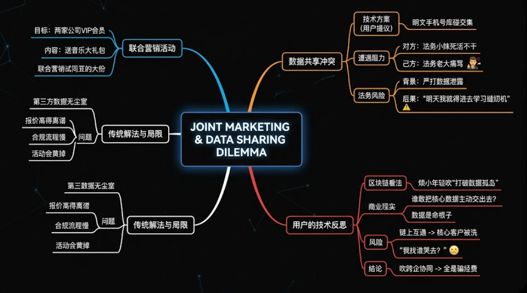 事情极其憋屈。我们两家的业务部门非要搞联合营销,说只要同时是我们两家的VIP会员就送音乐大礼包。我跟对方说那行,咱们把两边VIP手机号库拿出来跑个脚本碰一下交集。结果对方法务小妹死活不干,我们法务老大也把我痛骂一顿。法务老大指着我鼻子说,现在严打数据泄露,我敢把明文手机号传出去,明天我就得进去学习缝纫机。传统的解法是找个第三方数据无尘室,但那帮人报价高得离谱不说,走完合规流程这活动早黄了。