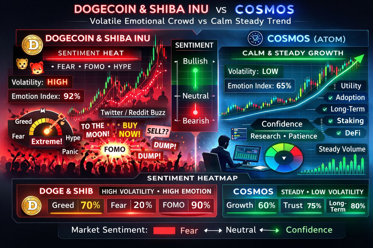 Community-driven assets like $DOGE amplify emotional cycles. Narrative tokens like $SHIB move with crowd momentum. Utility ecosystems like $ATOM show steadier behavioral patterns.