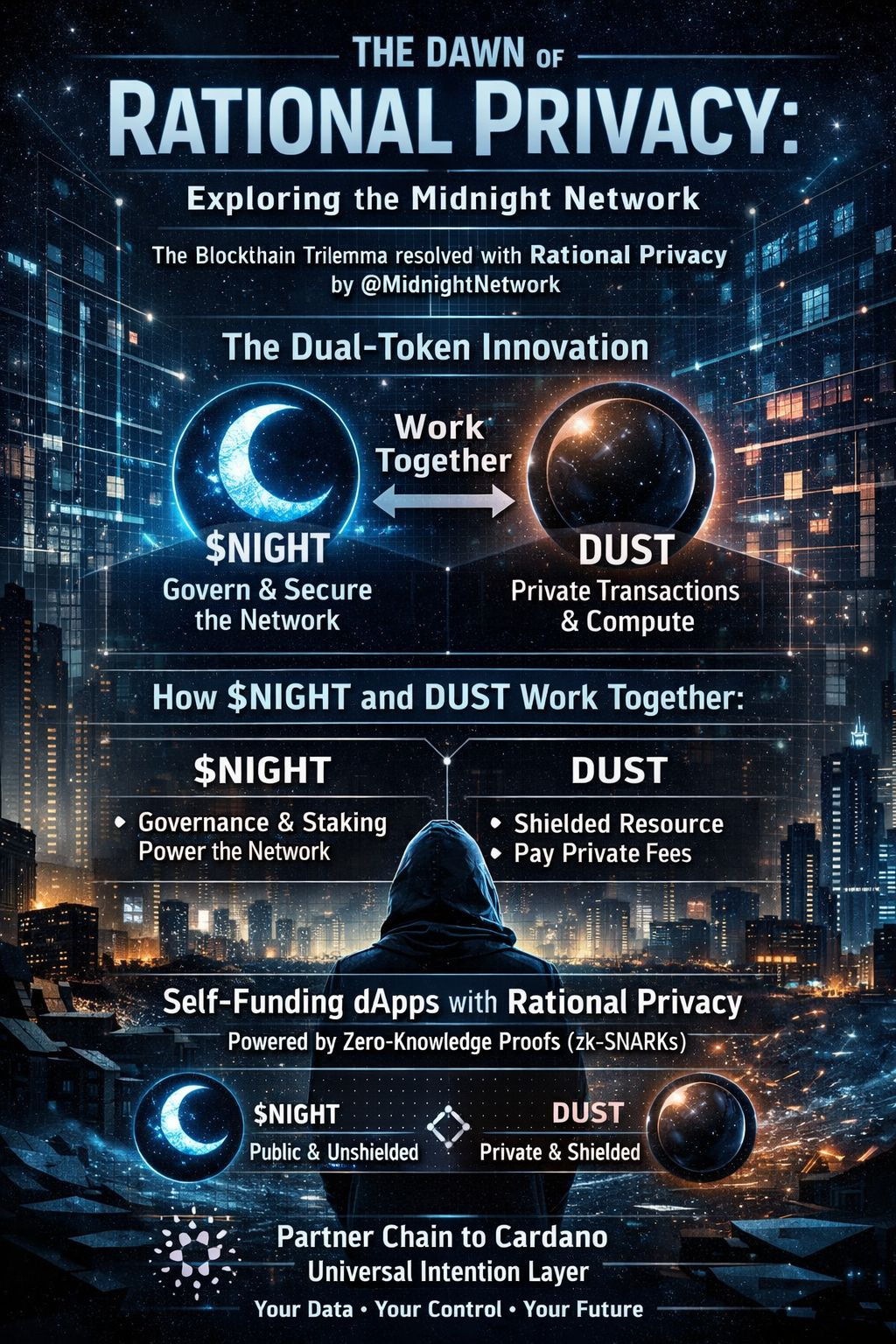 By separating governance ($NIGHT) from operational fuel (DUST), Midnight enables developers to build self-funding dApps where users don't need to worry about fluctuating gas fees. As a partner chain to Cardano, it inherits robust security while providing the "Universal Intention Layer" for a future where personal data remains in the hands of the user, not the ledger. #night