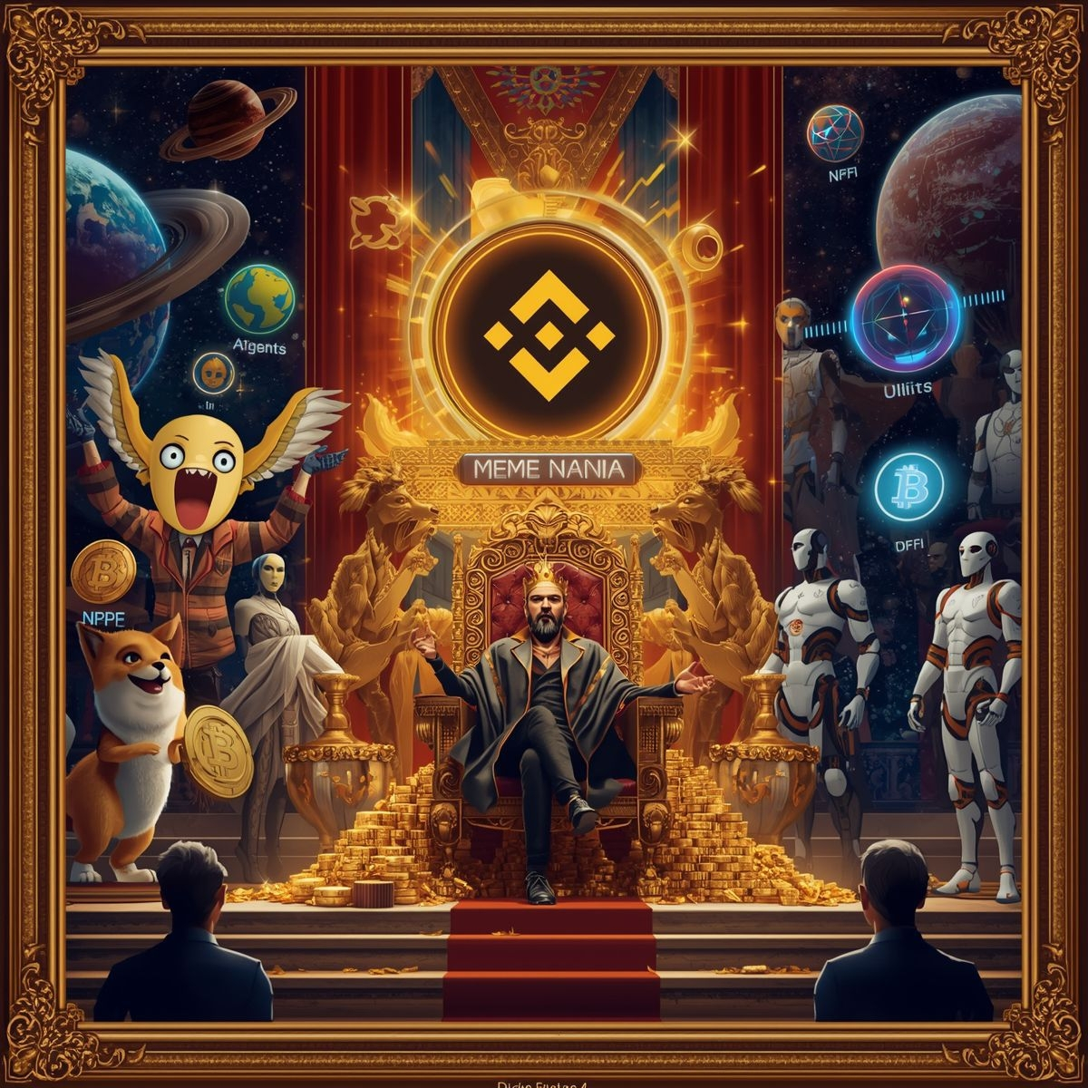 At its center, a golden throne glows beneath the Binance seal, surrounded by lions, humanoid guardians, and the symbols of meme culture — Shiba Inu, Bitcoin, and cosmic visions of digital wealth. This is not just art. It is legacy packaged in pixels, a cultural bridge between crypto memes and regal ceremonial branding.