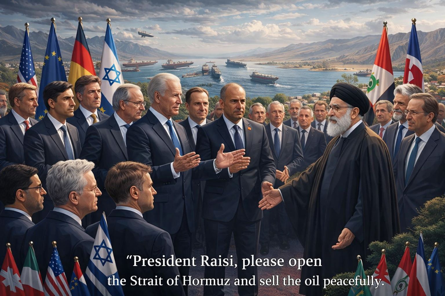 This 16K digital artwork, Diplomatic Horizon: Hormuz Peace Accord, captures the emotional gravity of that plea. Set against the backdrop of oil tankers and naval ships, the image shows Iran’s President Ebrahim Raisi facing a coalition of Western leaders — Biden, Herzog, Macron, Sunak, Scholz, and more — all extending hands of peace.