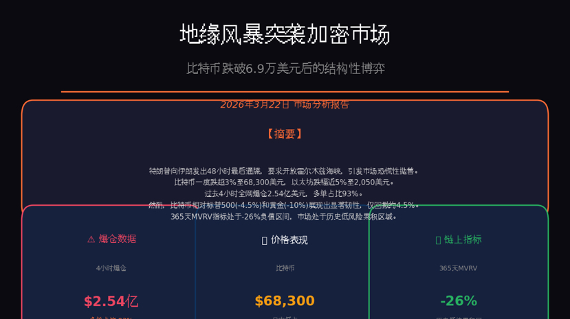 2026年3月22日,加密货币市场遭遇突发性地缘政治冲击。特朗普政府要求伊朗48小时内开放霍尔木兹海峡的 ultimatum 引发市场恐慌性抛售,比特币一度跌超3%跌破6.83万美元,以太坊跌幅接近5%逼近2050美元。过去4小时全网爆仓2.54亿美元,其中多单占比高达93%。然而,从链上数据观察,比特币相较传统风险资产展现出显著韧性——同期标普500下跌4.5%,黄金跌幅近10%,而比特币仅回撤约4.5%。365天MVRV指标处于-26%的负值区间,表明长期投资者仍处于浮亏状态,市场处于历史低风险的累积区域。当前市场正处于"聪明资金"重新布局与散户恐慌抛售的结构性博弈阶段。