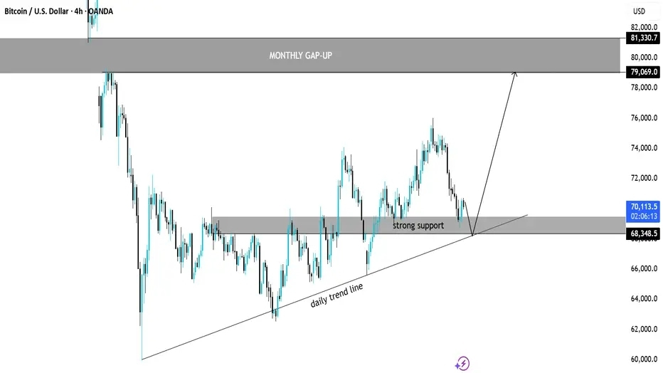 Se il prezzo mantiene questo supporto, possiamo aspettarci un forte rimbalzo verso la zona di gap mensile intorno a 79K–81K. Questo indicherebbe che i compratori stanno tornando e la continuazione della tendenza di lungo termine.