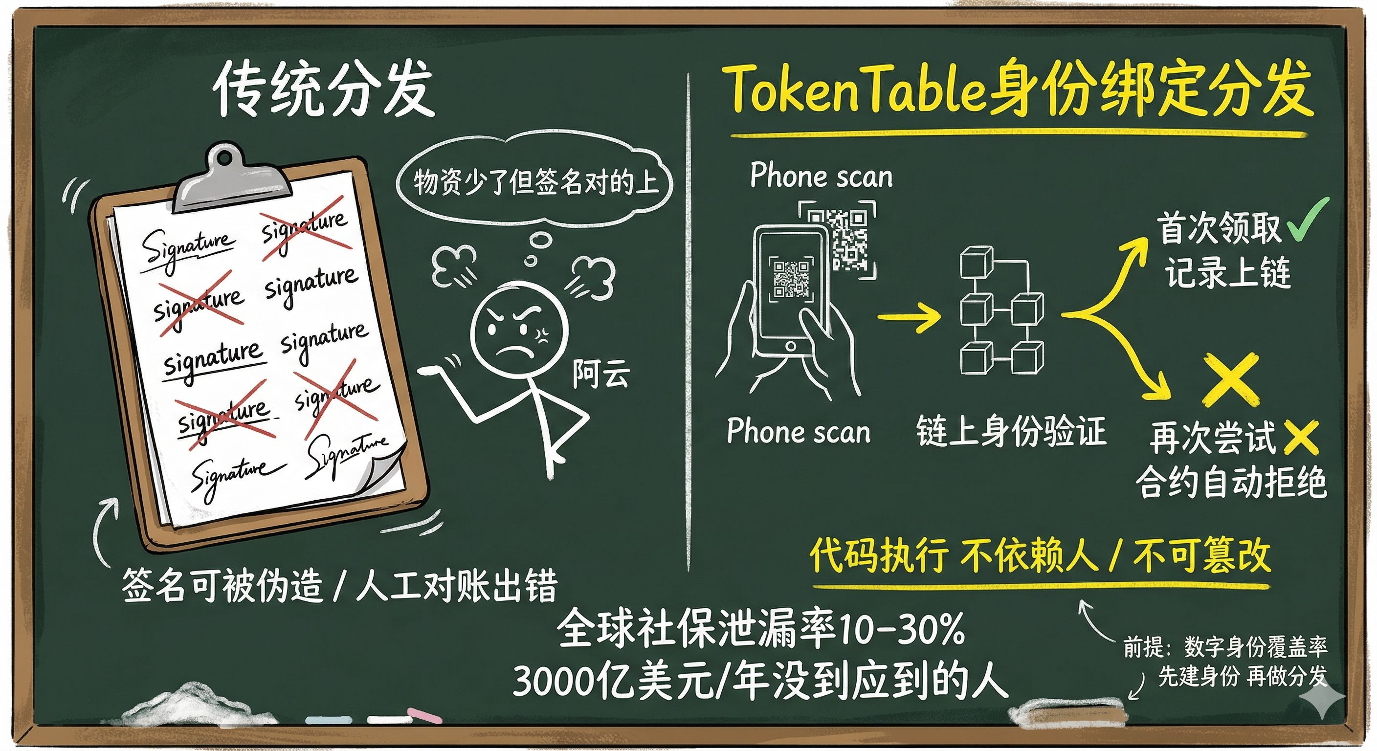 别以为只有发大米会被冒领。全球社会保障、农业补贴每年几万亿美金盘子,起码有 10% 到 30% 是在半道被各路神仙截胡了。几千年来防蛀虫的法子是加派监督员,但这完全是饮鸩止渴——只要是人,就能被收买。TokenTable 最狠的是把“人”这个最大风险源踢出局。代码不懂人情世故,不收回扣,说只给一份,天王老子来了也挤不出第二滴水。