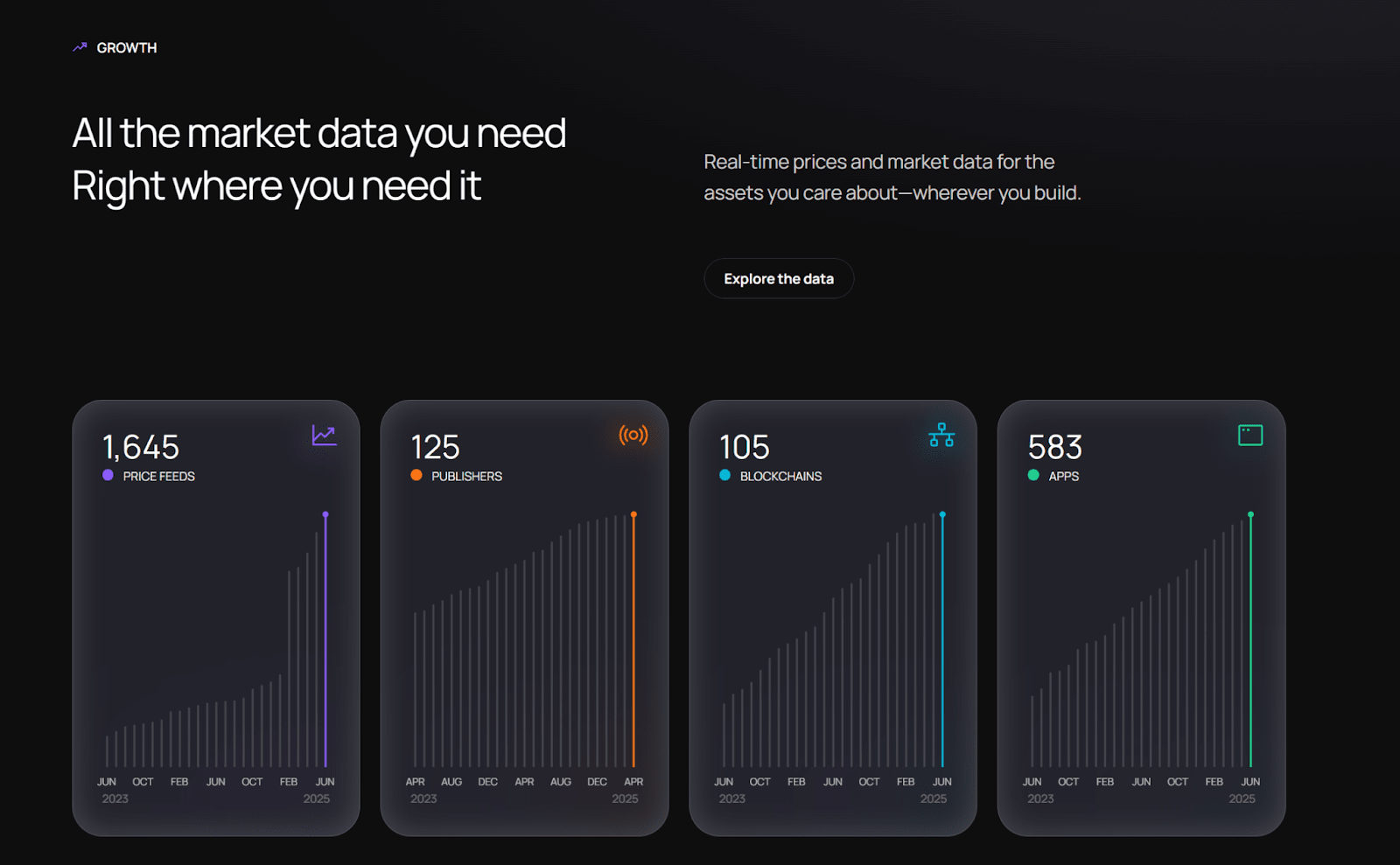 Pyth Network ha dimostrato una rapida crescita e adozione, espandendosi da Solana a 78 blockchain in pochi anni. La sua integrazione con oltre 420 dApp e protocolli, combinata con più di 115 fornitori di dati di primo livello, evidenzia sia la validazione tecnica che istituzionale.
