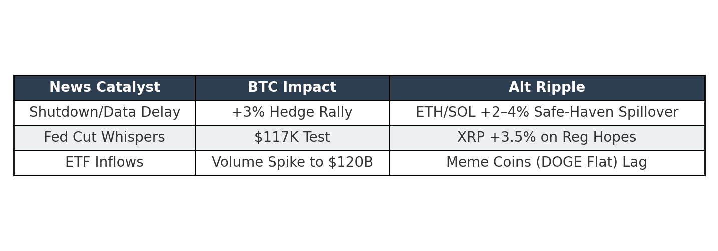 L'elefante nella stanza? La chiusura notturna dello zio Sam—la prima dal 2018—si profilava grande, ritardando i dati occupazionali di settembre e i rapporti CPI, lasciando i mercati in un vuoto di dati. Wall Street ha oscillato (S&P in calo dello 0.5%), ma il cripto ha cambiato le carte in tavola: la narrativa del "gold digitale" di BTC è esplosa, con afflussi che ruotano dall'oro fisico (in aumento dell'1.5% ma in ritardo) come coperture contro la farsa fiscale.