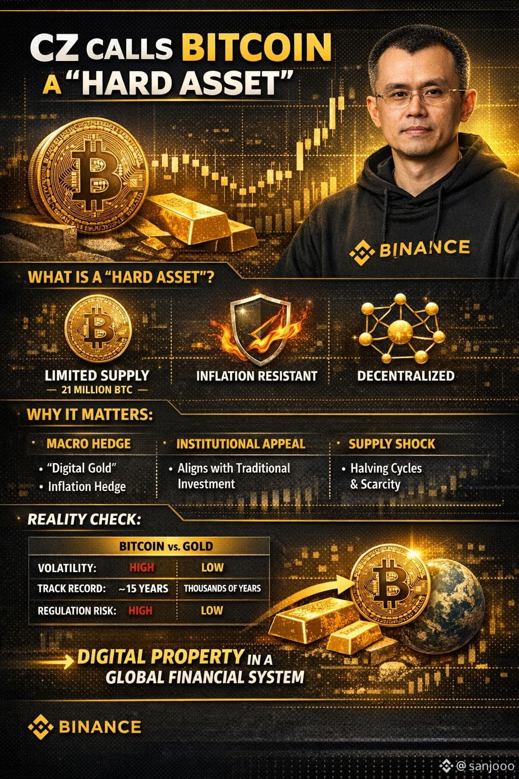 When CZ refers to Bitcoin as a hard asset, he’s positioning it alongside assets like gold—limited supply, resistant to inflation, and not easily manipulated.