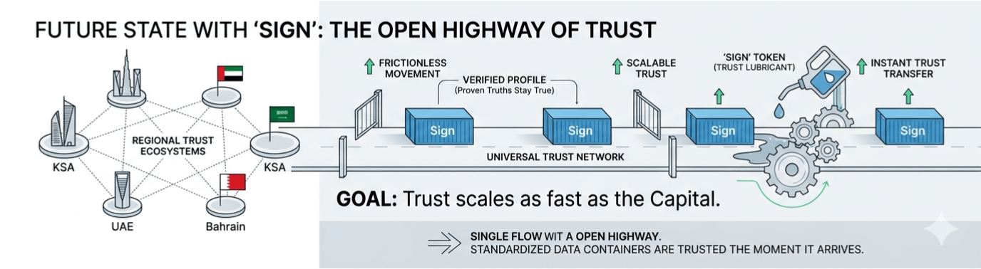 When you look at Sign through the lens of this specific growth story it stops being about the abstract concept of decentralized identity and starts being about the physics of movement. It is about whether a verified profile can carry its original context across borders without needing a translator or a second opinion. If they pull this off then the token is not just some speculative asset or a piece of paperwork on a blockchain but the actual lubricant for a regional machine that is trying to move at the speed of light. We are essentially moving away from the era of the locked gate and toward the era of the open highway. If the old way of doing things was like a series of disconnected walled gardens then Sign is trying to be the universal freight container that ensures the cargo inside is trusted the moment it arrives at the dock.