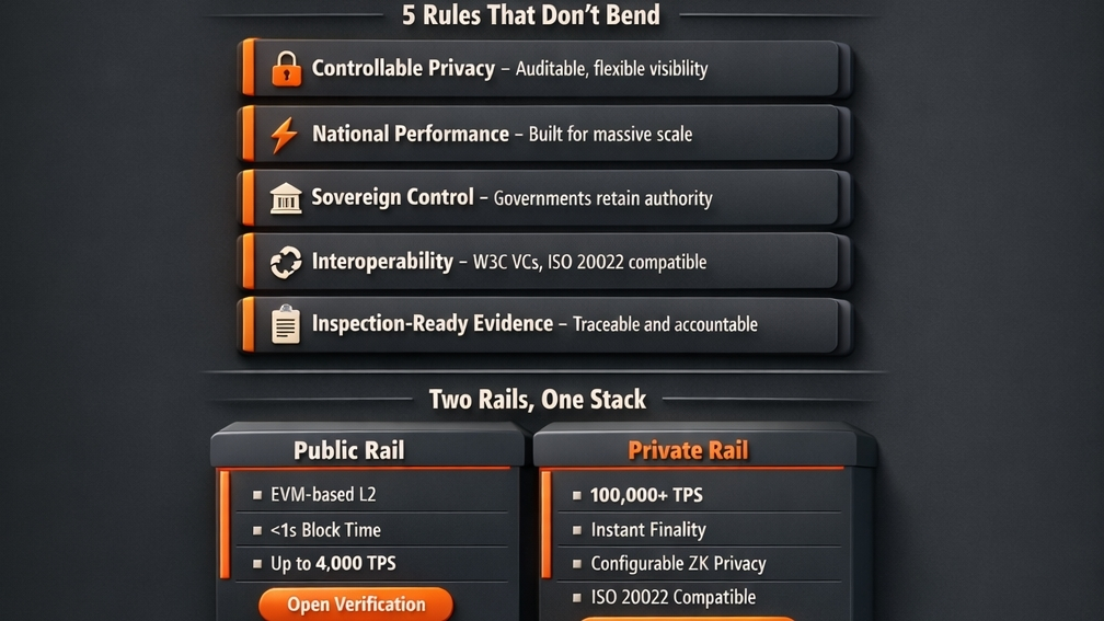 Il binario pubblico è basato su EVM L2, tempo di blocco inferiore a 1 secondo, fino a 4.000 TPS. per la trasparenza della finanza pubblica e la verifica aperta. Il binario privato è l'infrastruttura CBDC con oltre 100.000 TPS, finalità immediata, privacy ZK configurabile, compatibile ISO 20022.