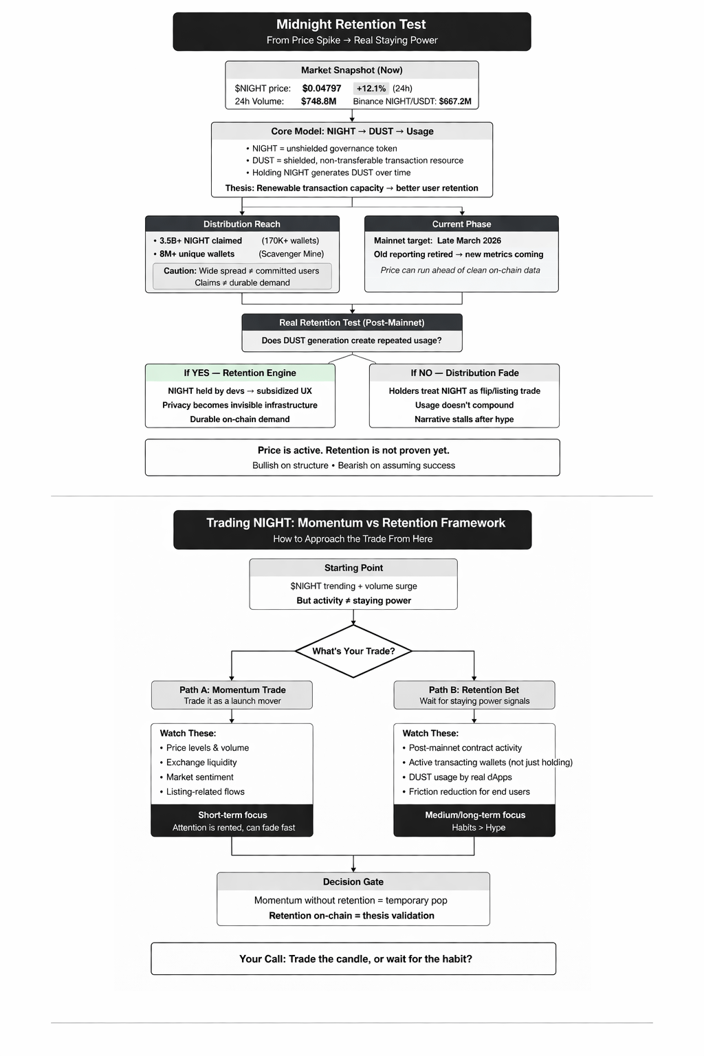 Ma non sono ancora completamente convinto. Nell'ultimo mese, NIGHT è ancora sceso di circa il 19,2% rispetto al dollaro anche dopo il rimbalzo di oggi. Questo mi dice che il mercato sta ancora discutendo se questa sia una rete con una domanda durevole davanti a sé o solo una narrativa forte che gode temporaneamente della liquidità degli scambi e dell'attenzione al lancio. Posso rispettare il caso rialzista senza fingere che il caso ribassista sia debole. Rialzista sulla struttura, ribassista assumendo che la retention sia già dimostrata. È qui che mi trovo oggi. Cosa cambierebbe la mia opinione in entrambe le direzioni? Voglio vedere attività di contratto ripetuta dopo il mainnet, migliori rapporti pubblici sui wallet attivi che effettivamente effettuano transazioni invece di semplicemente detenere, e prove che i costruttori stanno usando DUST generato da NIGHT per rimuovere le frizioni per gli utenti finali. Midnight ha mostrato segni precoci di crescita dell'ecosistema, inclusa un aumento dell'8% degli indirizzi di wallet unici e un aumento del 29% dei contratti intelligenti distribuiti nel suo aggiornamento della rete di ottobre 2025, ma ora la barra è più alta. I progressi del testnet sono stati utili. La retention del mainnet è il vero esame. Quindi sì, NIGHT è in tendenza, il movimento del prezzo è reale e il volume conferma che i trader stanno prestando attenzione. Ma l'attenzione è facile da affittare. La retention è costosa. Se stai puntando a questo scambio, non guardare solo la candela. Guarda se Midnight può trasformare la proprietà distribuita in utilizzo ripetuto e se DUST diventa una ragione per rimanere invece di essere solo un'altra meccanica token di cui twittare. Questa è la scommessa intera. Sono cautamente rialzista sull'architettura e cautamente ribassista sul mercato che assume che la parte difficile sia fatta. Stai scambiando NIGHT come una moneta di slancio di lancio, o stai aspettando di vedere se la retention si mostra effettivamente on-chain?