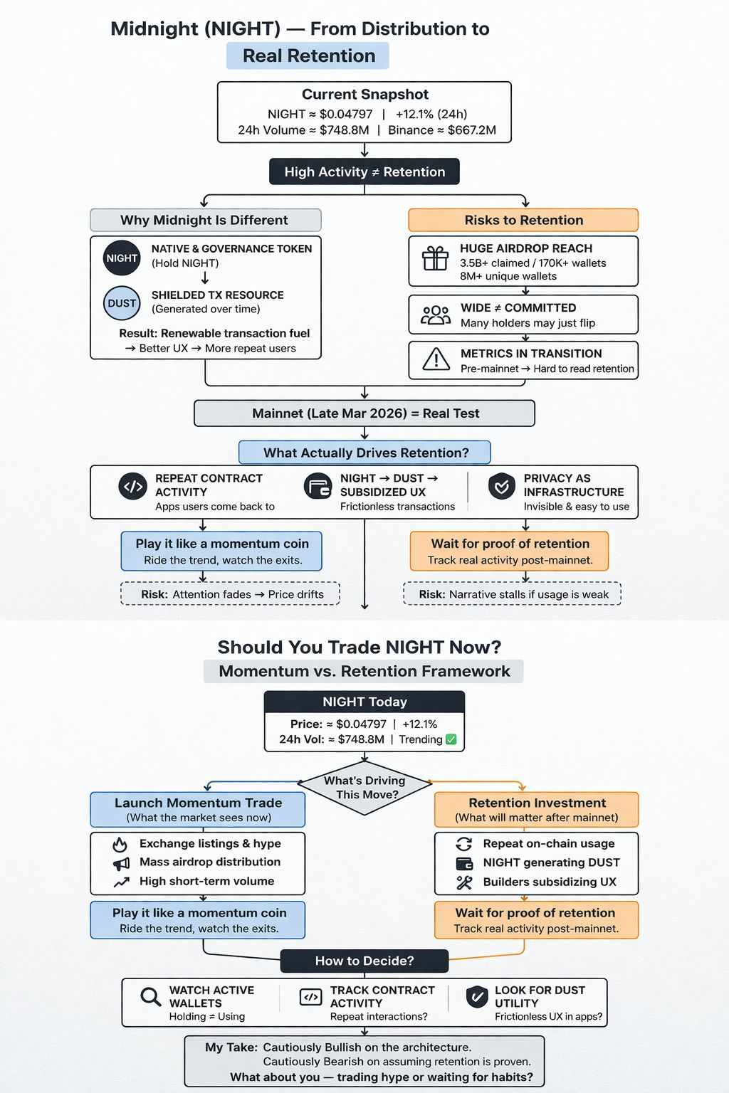 L'ho imparato a mie spese con le negoziazioni sulla privacy qualche ciclo fa. Vedevo un movimento brusco, un'ondata di post che sembravano intelligenti, poi scavavo un livello più in profondità e realizzavo che gran parte della convinzione era costruita su un teatro di scarsità, non sulla capacità di mantenere. Ecco perché guardo Midnight in modo diverso. Oggi, NIGHT viene scambiato intorno a $0.04797, in aumento del 12,1% nel giorno, con circa $748,8 milioni di volume nelle 24 ore, e la coppia NIGHT/USDT di Binance da sola sta facendo circa $667,2 milioni di quel totale. Il nastro è attivo. Nessun dubbio. Ma l'attività non è la stessa cosa della retention, e per i trader quel divario importa più di quanto la gente ammetta. Ciò che continua a riportarmi a Midnight non è solo l'angolo della privacy. È il modello operativo dietro di esso. Midnight descrive NIGHT come il token nativo e di governance non protetto, mentre DUST è la risorsa protetta, non trasferibile, utilizzata per pagare le transazioni e eseguire contratti intelligenti. Possedere NIGHT genera DUST nel tempo. Pensalo come possedere la macchina che continua a produrre crediti di utilizzo invece di comprare costantemente carburante sul mercato aperto. Questo cambia il modo in cui penso al comportamento degli utenti, perché una rete con capacità di transazione rinnovabile ha una possibilità migliore di mantenere costruttori e utenti ripetuti rispetto a una che fa sentire ogni interazione come una nuova tassa.