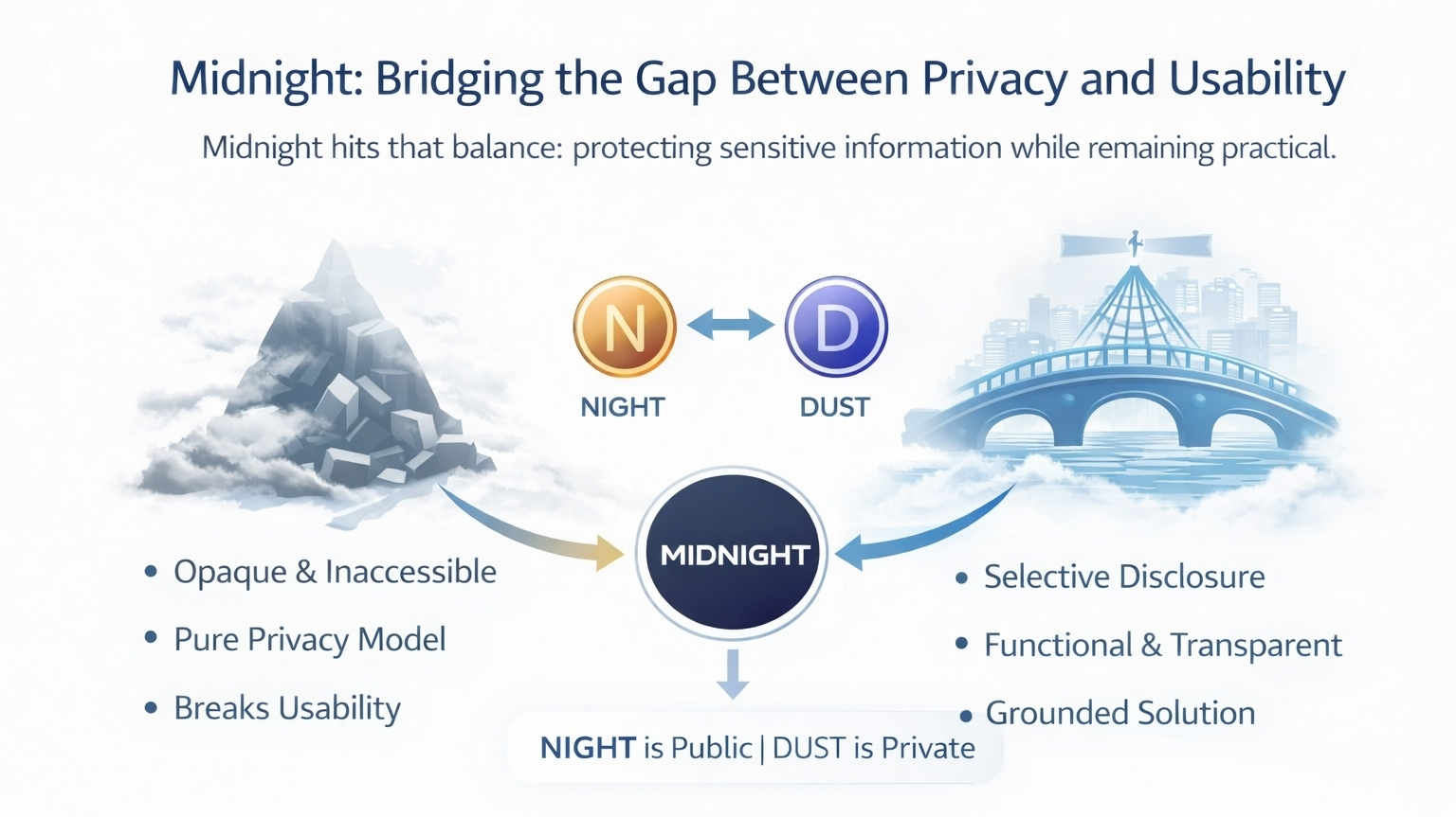 What struck me first is that they aren't treating privacy like a religion. I’m exhausted by projects that treat total opacity as the end goal, as if hiding everything magically solves the massive hurdle of building something people actually want to use. Midnight feels more grounded. More specific. The logic is simple: protect the sensitive stuff, reveal what’s necessary, and don't turn the system into a black box that nobody can trust.