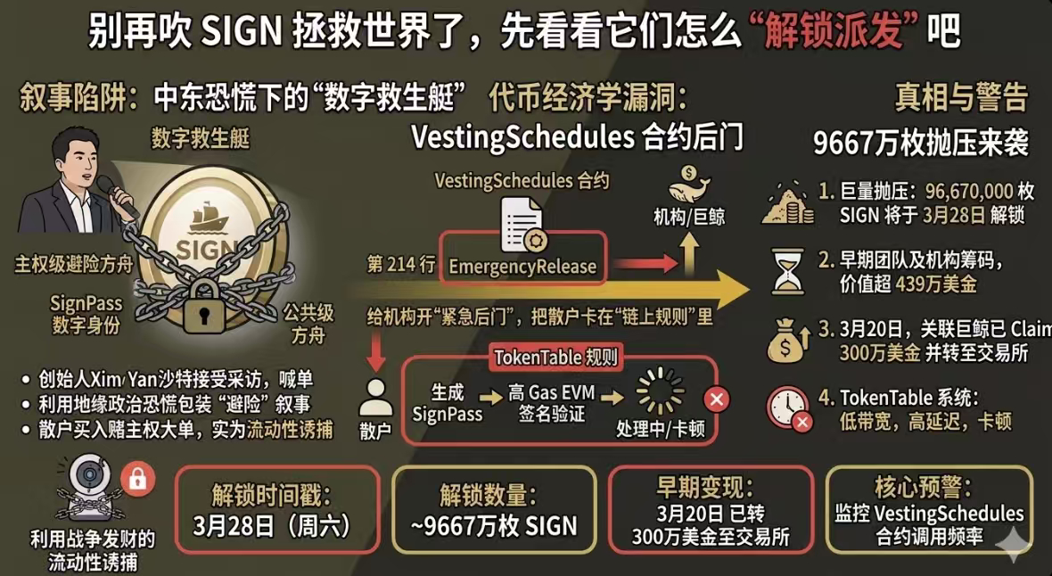算完这笔深藏在地缘政治烟雾弹背后的解锁账单,我不仅把所有关于SIGN的现货全清了,我甚至对当前整个币圈这种“利用战争发财”的叙事操纵感到了一种彻骨的恶心。在这个被包装成“人类救星”的凭证网络里,正在发生一场极其合规、且完全由底层代币经济学漏洞触发的流动性诱捕与集体收割。