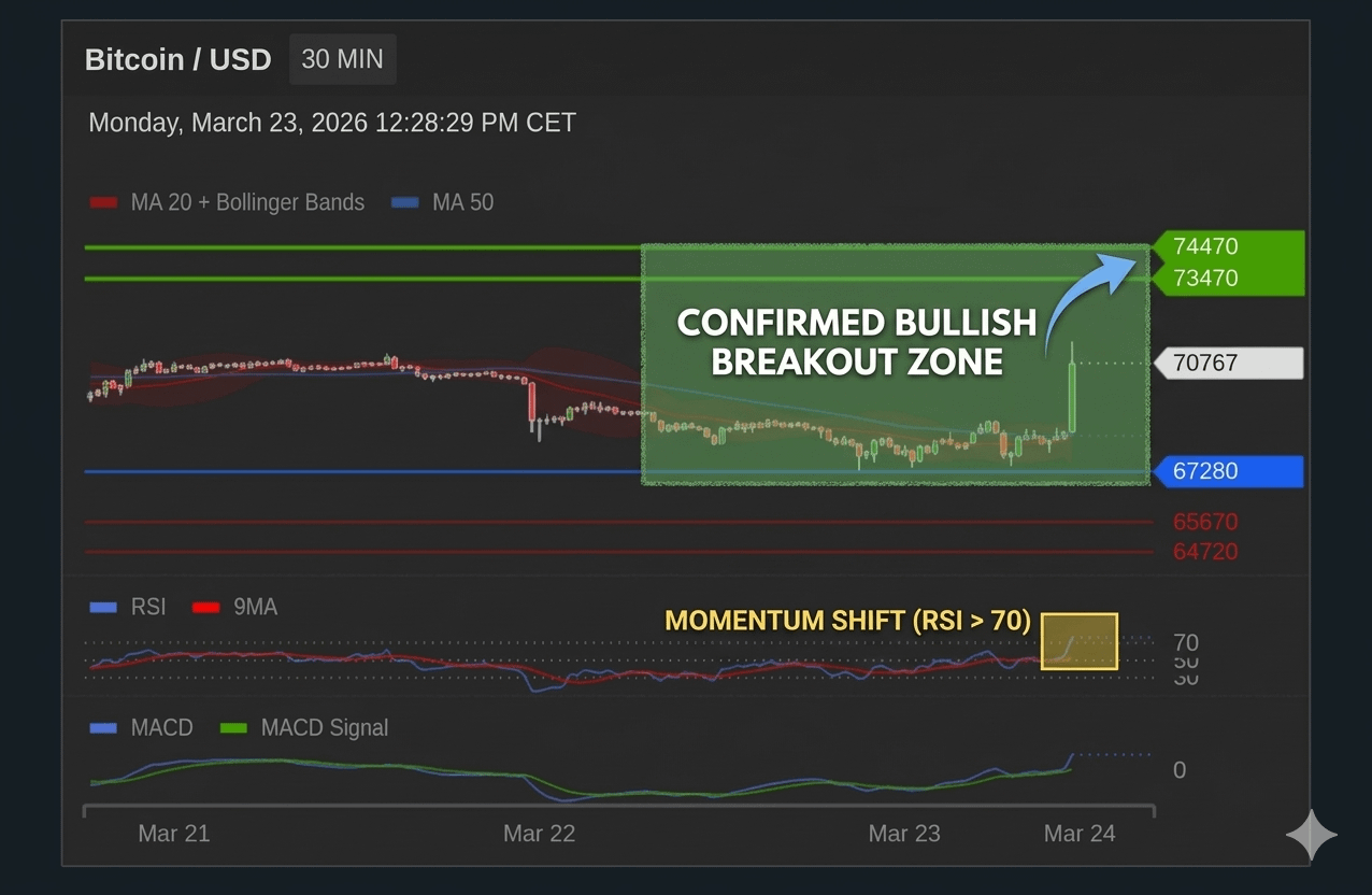 * Azione del Prezzo: BTC ha superato la barriera psicologica dei $70.000, attualmente vicino a $70.767. Questo movimento ha effettivamente attraversato i precedenti livelli di resistenza a breve termine.