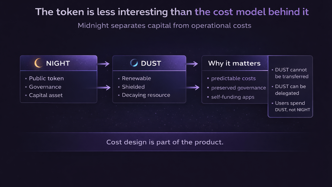 La pagina ufficiale del token di Midnight descrive un design a doppio componente dove NIGHT è il token nativo pubblico e di governance, mentre DUST è la risorsa protetta utilizzata per pagare le transazioni e eseguire contratti intelligenti. Possedere NIGHT genera automaticamente DUST. In altre parole, Midnight separa il livello di capitale dal livello operativo anziché costringere un'attività a svolgere entrambi i compiti contemporaneamente.
