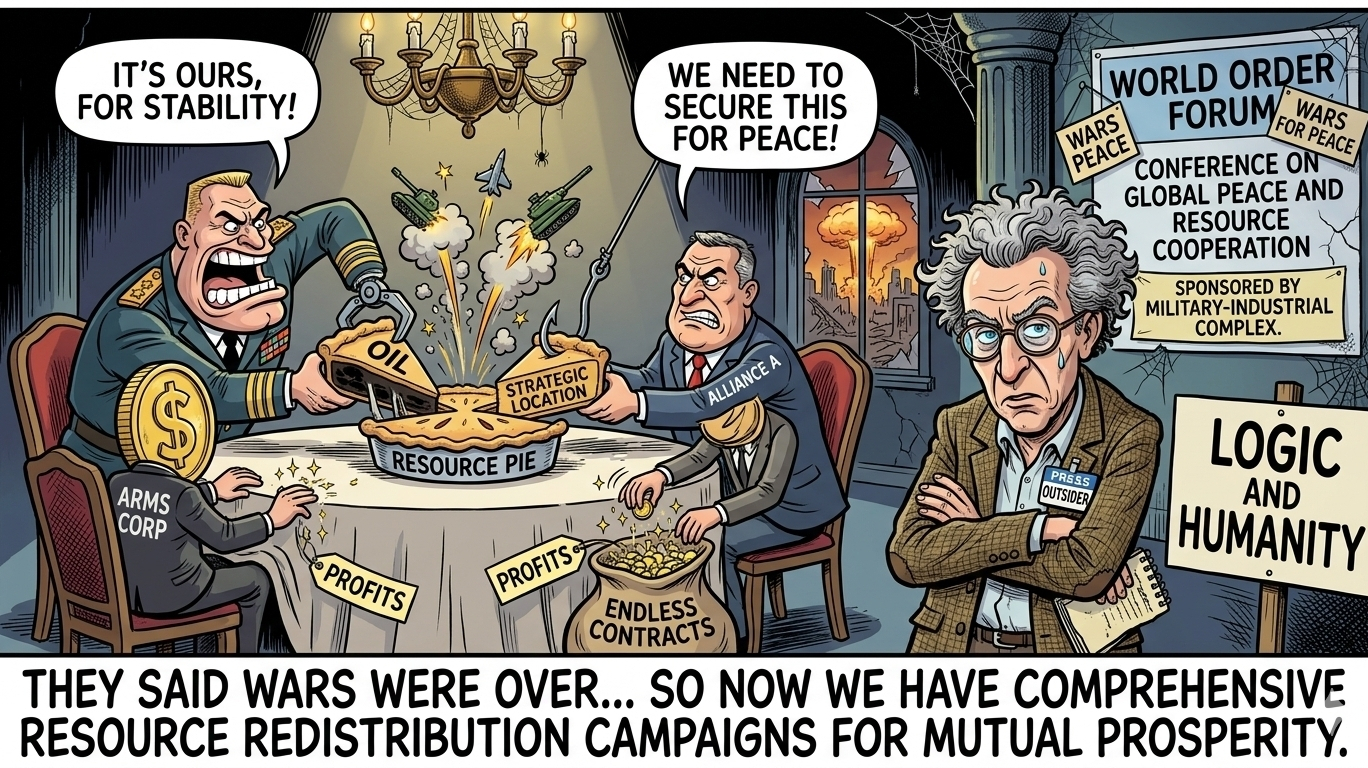 Mentre il "Complesso Militare-Industriale" trae profitto dal caos continuo, gli investitori saggi traggono profitto dalle correzioni di mercato. Questa illustrazione cattura perfettamente i due lati: la forza rumorosa, affamata di risorse e distruttiva e il pensatore silenzioso, razionale e a lungo termine.
